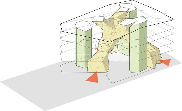 The Twist外觀猶如紙牌狀扭轉,是由40公分的寬鋁板排列而成,而內部亦運用了同樣的原理,建材則是白色的杉木板。「不論從哪個角度看,你都能看到拱形、曲線、螺旋形以及鞍形,但當仔細觀察時便會發現,這些建材是由直形的鋁板及木板所構成」, BIG建築事務所的建築師Bjarke Ingels表示,由理性的重複元素卻能建構出富有生命力的有機建築。