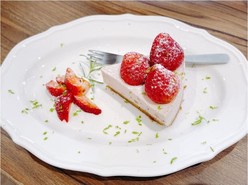 草莓果粒生乳酪蛋糕,鮮草莓上方灑上了檸檬碎屑增添了酸香的清新氣味,最底下的餅乾底口感也不會太乾,搭配上方冰冰涼涼的草莓生乳酪起入口剛剛好。