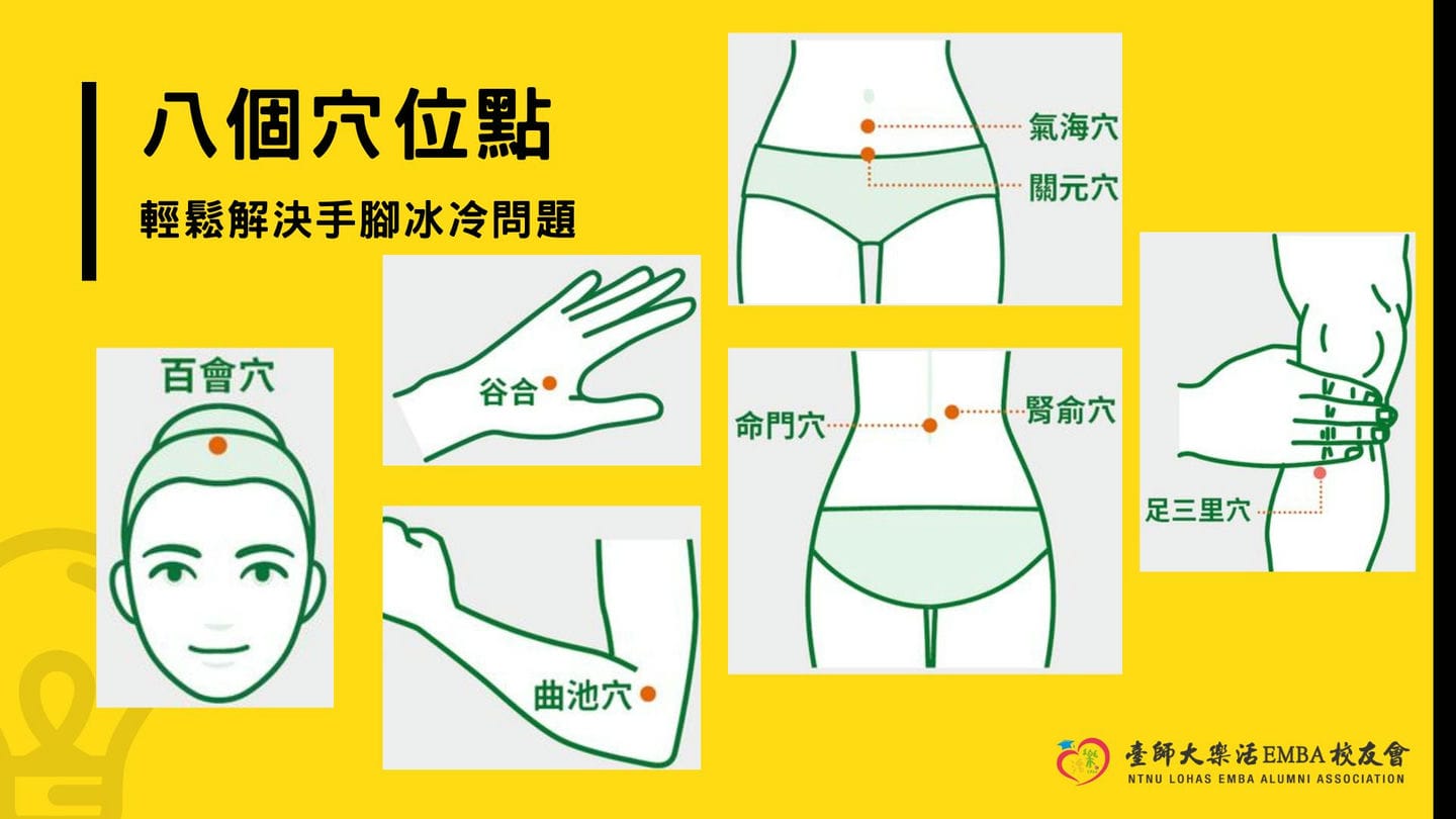 穴道按摩對於手腳冰冷也有一定療效,從頭到腳都有穴道可以幫助改善虛寒的體質。以下介紹幾個穴位,可嘗試每天按摩5~10分鐘,就能讓身體暖起來。